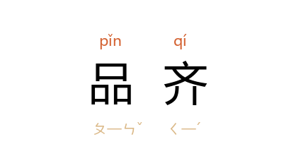 引《元典章·刑部六·品官相殴》:“县尉 和元,皇庆 二年三月初一日习仪,因与本县达鲁花赤 揑古伯 品齐排拜致争。”郭沫若 《屈原赋今译·离骚》:“我的车从聚集着有一千多乘,品齐着玉制的轮子并辔而驰。”