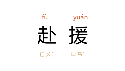 引《新唐书·太宗纪》:“大业 中, 突厥 围 煬帝 鴈门,煬帝 从围中以木繫詔书,投 汾水 而下,募兵赴援。”《明史·李成梁传》:“成梁 赴援有功,进副总兵,仍守 险山。”郭沫若 《山中杂记·芭蕉花》:“后来遇着赴援的官军才得了解放。”