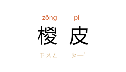 ⒈ 亦作“棕皮”。棕榈树干上包裹着的一层由叶鞘形成的纤维状物。可加工成棕丝,也可直接用作编结蓑衣等的原料。棕皮的基部可入药,有收敛止血之功能。