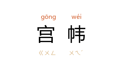 引清 李渔 《玉搔头·媲美》:“孽姻缘难保各东西,怎容易入宫幃!”清 洪昇 《长生殿·傍讶》:“宫幃事,费安排。”曹禺 《王昭君》第一幕:“她有资历,好摆架子,知道宫帏中许多秘闻。”