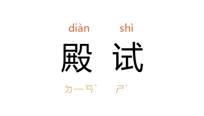 ⒈ 科举考试中最高一级。皇帝亲临殿廷策试。也称廷试。源于 西汉 时皇帝亲策贤良文学之士。始于 唐 武则天 天授 二年于 洛阳 殿前亲策贡举人,但尚未成定制。 宋 开宝 八年, 太祖 于 讲武殿 策试贡院合格举人,并颁定名次,自此始为常制。 太平兴国 八年,将殿试后进士分为五甲。 元 无殿试。 明 清 殿试后分为三甲:一甲三名赐进士及第,通称状元、榜眼、探花;二甲赐进士出身,第一名通称传胪;三甲赐同进士出身。参阅 清 赵翼 《陔馀丛考·殿试》。