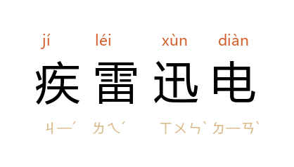 ⒈ 疾、迅:快速,迅急。突然暴发的雷声和出现的闪电。形容来势迅猛,来不及防备。