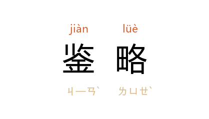 引《晋书·殷仲堪传》:“而用计倚伏烦密,少於鉴略,以至於败。”《北史·李灵李孝伯等传论》:“孝伯 风范鉴略,盖亦过人。”唐 司空图 《故盐州防御史王纵追述碑》:“开成 中,宰相 郑公 肃允 属镇临,尤称鉴略,仰贤有素,授任不疑。”