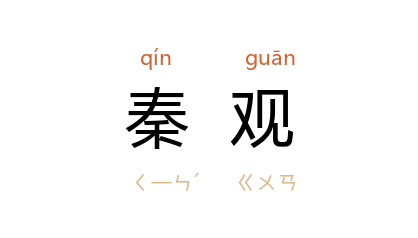 ⒈ 人名。(西元1049~1100)字少游,号太虚,宋高邮人。官太学博士,累迁国史院编修官。少豪隽慷慨,工诗文,词风柔婉,世称秦淮海。著有《淮海集》四十卷。