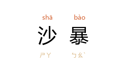 ⒈ 夹带大量沙尘的风暴。由强风所引起,多形成于沙漠地区。发生时,风沙强烈,天昏地暗,使人摸不清方向,常易造成危险。