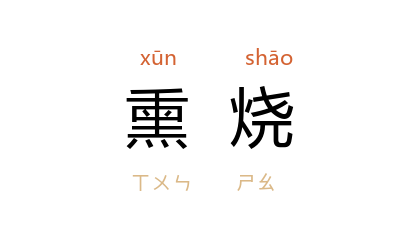 ⒊ 一种烹调方法。指用木柴、木屑等的烟火灼炙食物。