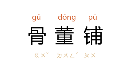 引清 钱泳 《履园丛话·收藏·总论》:“大约千人之中,难得一人爱之,即爱之而不得其爱之之道,虽金题玉躞,插架盈箱,亦何异于市中之骨董铺邪?”《证俗文》卷十七引 清 吕种玉 《言鲭》:“今卖杂玩宝货肆曰骨董铺。”
