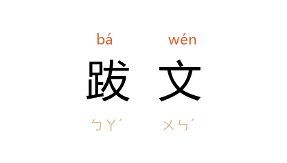 ⒈ 写在文章、书籍或画册后面的文字,内容多为后记、评介等。一般单称为「跋」。