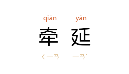 引明 归有光 《与傅体元》之一:“僕思归之心甚切,中祕有书数万卷,欲读一过,为此牵延未能决也。”中国近代史资料丛刊《辛亥革命·孙文革命运动清方档案》:“黄槐森 官声素好,军务或非所长,儻牵延日久,兵机销钝……后患伊于胡底。”郭沫若 《反正前后》第二篇一:“对于革命党人的屠杀,对于立宪运动的牵延敷衍……这些都是封建势力的独裁专擅、倒行逆施的表现。”
