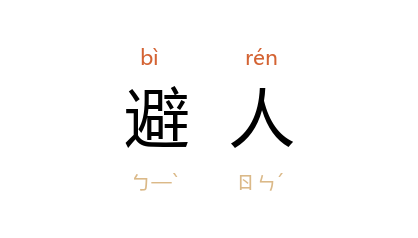 引唐 吴融 《偶书》诗:“只此无心便无事,避人何必 武陵源。”清 王士禛 《池北偶谈·谈艺一·阮怀宁》:“阮 避人於此山,每夕与狎客饮,以三鼓为节。”亦指避世之人。 清 方文 《乾明寺杂咏》:“野寺荒凉三五间,避人于此暂休閒。”