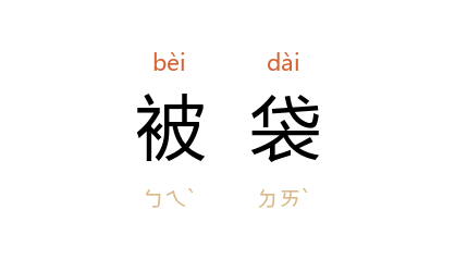 ⒈ 即被囊。 唐 李匡乂 《资暇集》卷下:“被袋,非古制,不知孰起也。比者远游行则用。 大和 九年,以十家之累者,邐迤窜謫,人人皆不自期,常虞仓卒之遣,每出私第,咸备四时服用。旧以细革为腰囊,置於殿乘,至是服用既繁,乃以被袋易之,成俗于今。参见“被囊”。