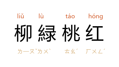 ⒈ 杨柳碧绿,桃花红艳。形容春天绚丽多彩的样子。也作「桃红柳绿」。