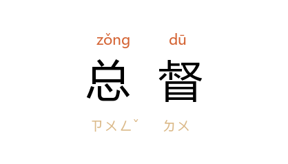 ⒊ 官名。 明 代初期在用兵时派部院官总督军务,事毕即罢。 成化 五年始专设 两广 总督,后各地逐渐增置,成为定制。 清 代始正式以总督为地方最高长官,辖一省或二三省,综理军民要政,例兼兵部尚书及都察院右都御史衔。另有主管河道及漕运事务者称河道总督、漕运总督。