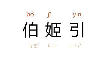 ⒈  古琴曲名。传说为 春秋 时 宋共公 夫人 伯姬 保母所作。保母悼 伯姬 因守义而遇火焚之灾,援琴而歌《伯姬引》。见 汉 蔡邕 《琴操·伯姬引》。 《乐府诗集·琴曲歌辞一题解》作“伯妃引”。详“伯姬”。
