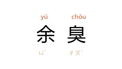 ⒈  残留的臭气。 《南史·到溉传》:“时 何敬容 以令参选,事有不允, 溉 輒相执。 敬容 谓人曰:‘ 到溉 尚有餘臭,遂学作贵人。’ 敬容 日方贵宠,人皆下之, 溉 忤之如初。