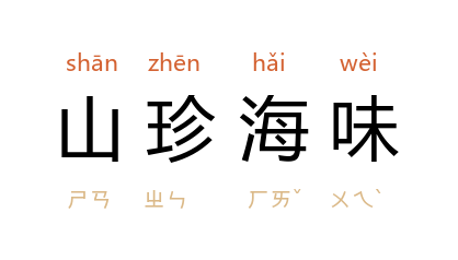 ⒈ 山林和海洋里产的各种珍贵的食品,泛指美味佳肴。
