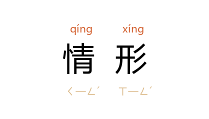 ⒈ 事物的实际状况。也作「情况」、「情状」。