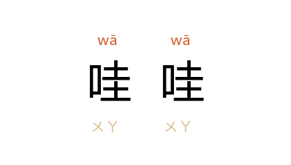⒊ 状声词:(1) 形容小孩刚学说话的声音。宋·苏洵〈张益州画像记〉:「有童哇哇,亦既能言。」(2) 形容哭、笑声。《老残游记》第二回:「那孩子只是哇哇的哭,并不说话。」(3) 形容叫喊声。(4) 形容鸟叫声。《水浒传》第七回:「正在那喧哄,只听得门外老鸦哇哇的叫。」