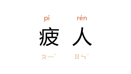 引晋 潘岳 《西征赋》:“俄命予以末班,牧疲人於西夏。”唐 元稹 《弹奏剑南东川节度使状》:“伏乞圣慈,勒本道长吏及诸州刺史,招缉疲人,一切却还产业,庶使孤穷有託,编户再安。”唐 白居易 《两朱阁》诗:“寺门敕牓金字书,尼院佛庭宽有餘。青苔明月多閒地,比屋疲人无处居。”