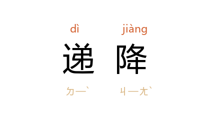 引明 沉德符 《野获编·礼部一·国初荫叙》:“用荫者孙降子,曾孙降孙,傍荫者,皆于荫叙品递降一级。”清 叶梦珠 《阅世编·钱法》:“泰昌、天启,享国日浅,钱不多行,式无甚美,亦无甚恶,惟铜质则递降耳。”丰子恺 《渐》:“因为其变更是渐进的……犹如从斜度极缓的长远的山坡上走下来,使人不察其递降的痕迹。”