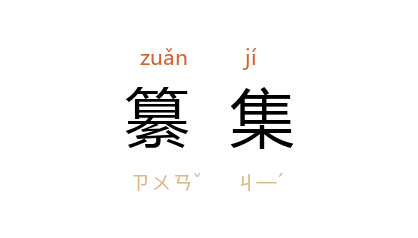 引《晋书·刑法志》:“虽时有蠲革,而旧律繁芜,未经纂集。”明 胡应麟 《少室山房笔丛·艺林学山八》:“杨用修 平生嗜古,盘胸纠腹,皆 秦、汉、六朝,而尤好纂集。”清 王士禛 《池北偶谈·谈艺六·木瓜诗解》:“至于《家语》所载夫子之説,乃 王肃 所纂集,固难尽信。”郭沫若 《文艺论集·<论诗三札>二》:“我常希望我们 中国 再生出个纂集《国风》的人物。”