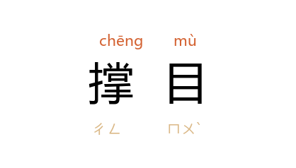 ⒈ 亦作“撑目”。睁大眼睛。形容发怒。