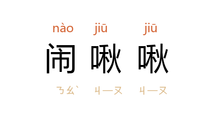 引元 无名氏 《货郎旦》第二折:“你还待要闹啾啾,越激的我可也怒齁齁。”明 郭子章 《郭氏六语·魏黄初谣》:“胡孙死,闹啾啾,也须还我一百州。”《吴骚·醉花阴·春怀》:“閙啾啾蝉鸣柳梢,絮叨叨虫吟砖窍。”