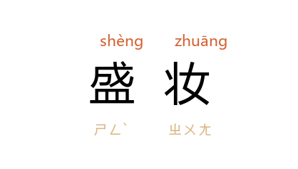 引《水浒传》第一二〇回:“李师师 盛粧上前,起居以罢。”《初刻拍案惊奇》卷六:“狄氏 到了这日晡时,果然盛妆而来。”清 蒲松龄 《聊斋志异·青娥》:“盛妆拜母,返身入室。”