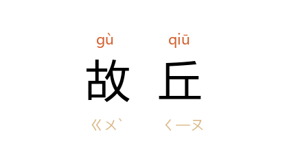 引唐 杜甫 《解闷》诗之二:“一辞故国十经秋,每见秋瓜忆故丘。”宋 苏辙 《次韵子瞻和渊明拟古》之八:“竿木常自随,何必返故邱。”明 陈汝元 《金莲记·蜀晤》:“蠨蛸门户,烟霞故丘,荒芜围径,庭幃白头,鷫鸘裘冷,难过秋时候。”清 钱谦益 《陆宣公墓道行》:“人言藁葬在 忠州,又云徵还返故邱。”