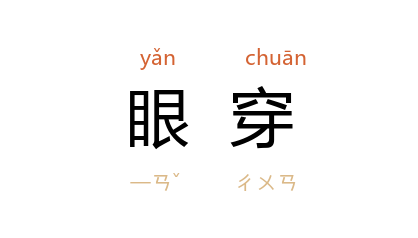 引唐 韩愈 《酒中留上襄阳李相公》诗:“眼穿常讶双鱼断,耳热何辞数爵频。”宋 梅尧臣 《独酌偶作》诗:“眼穿南去翼,耳冷北来音。”清 曾国藩 《岁暮杂感》诗之三:“莽莽寒山匝四围,眼穿望不到庭闈。”