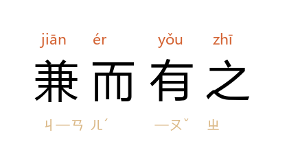 引《墨子·法仪》:「奚以知天兼而爱之,兼而利之也?以其兼而有之,兼而食之也。」北周·庾信〈周车骑大将军贺娄公神道碑〉:「君以才望,兼而有之。」