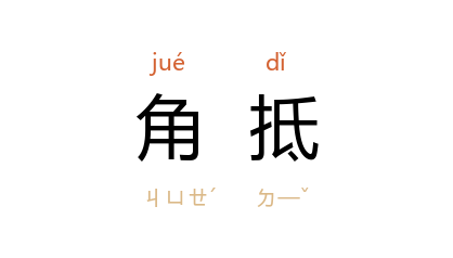 ⒉ 角牴:我国古代体育活动项目之一。参见“角抵”、“角觝”。