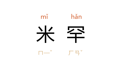 引元 关汉卿 《哭存孝》第一折:“米罕整斤吞,抹邻不会骑。”元 无名氏 《射柳捶丸》第三折:“阻孛 云:‘好米哈喫上几块。’”