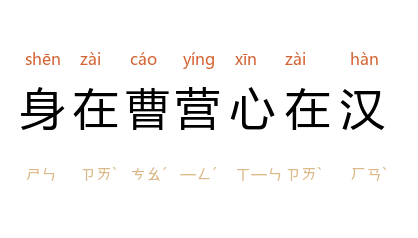 例如:「抗战期间,许多沦陷区的同胞莫不本著『身在曹营心在汉』的心思,时时刻刻都在想著为祖国效命。」