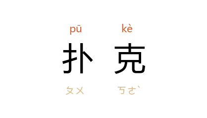 ⒈ 纸牌名。英语poker的音译。共五十二张,分黑桃、红桃、方块、梅花四组,每组十三张。另附丑角两张,玩法很多。
