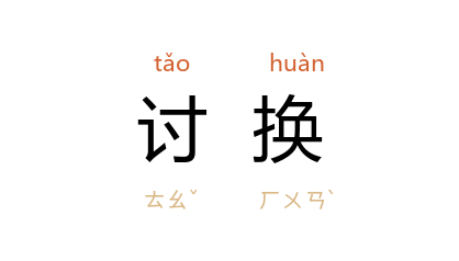 引孙犁 《白洋淀纪事·村歌上篇》:“他们能织这样的布?一道街上,都到我这里来讨换布样子。”孙犁 《蒿儿梁》:“老人们说:庄子上有的东西,凭是多么贵重,我们也给你们吃;要讨换这些东西,除非是到川里。”