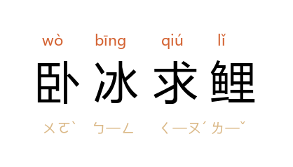 事亦见《晋书·王祥传》。又记 王延 为继母叩凌求鱼, 楚僚 为继母卧冰求鱼,故事略同。后遂以“卧冰求鲤”为孝亲的典实。亦省作“卧冰”。 《敦煌变文集·父母恩重经讲经文》:“泣竹卧冰也不及,百年侍养莫交亏。”