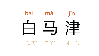 ⒈ 地名。在今河南省滑县北。战国时张仪说赵王守白马之津,苏代说燕王决白马之口,汉初使刘贾渡白马津,汉末关羽斩颜良解白马之围,皆指此地。