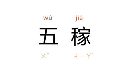 引晋 杜预 《论水利疏》:“今者水灾,东南特剧,非但五稼不收,居业并损。”《魏书·天象志三》:“岁主农事,火星以乱气干之,五稼旱伤之象也。”宋 司马光 《乞免永兴军路苗役钱札子》:“加之今年亢旱,五稼不熟,人户流移者,已闻不少。”清 曾国藩 《复陈右铭太守书》:“膏腴地亩,舍五稼而种罌粟。”