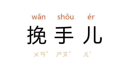 引《西游记·第一五回》:「圣僧,我还有一条挽手儿,一发送了你罢。」《金瓶梅·第三八回》:「玳安道:『来了,取挽手儿去了。』」