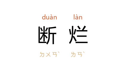 引清 周亮工 《书影》卷一:“若使但求谐于《房中》、《鐃吹》之调,取其字句断烂者而模范之,以为乐府如是,岂非 西子 之顰、 邯郸 之步哉!”清 梅曾亮 《赠孙秋士序》:“敝衣冠,独行市中,断烂古书外,不市他物。”清 魏源 《说文叚借释例》:“非竹简之断烂,即传写之譌佚。”