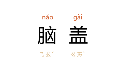 引元 杨暹 《刘行首》第三折:“将郎君脑盖敲,子弟每觔髓撅,怎当他转关儿有百计千谋设!”丁玲 《太阳照在桑干河上》十四:“﹝那个女人﹞黑油油的头发贴在脑盖上,剃得弯弯的两条眉也描黑了。”亦作“脑盖子”。 周立波 《暴风骤雨》第二部一:“沿脑盖子上,汗珠一股劲地往外窜。”