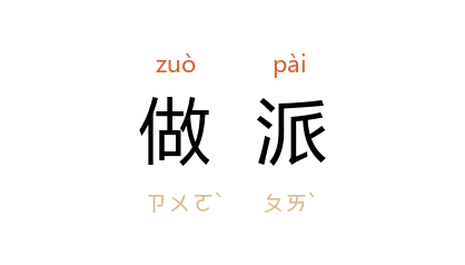 例如:「他到家中装模作样,做派了半天,才说出真正的用意。」