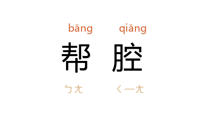 ⒈ 指戏曲演出中,后台或场上的帮唱,用以衬托演员的唱腔,渲染舞台气氛,或叙述环境和剧中人的心情。最初见于南戏。今地方戏曲仍用帮腔者有:川剧、湘剧、赣剧、潮剧、 安徽 青阳腔等。