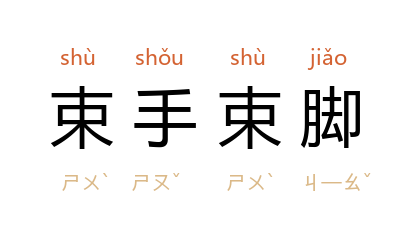 亦作“束手缚脚”、“束手束足”。 《何典》第八回:“冒失鬼 一味粗心浮气,目中无人,到处以强为胜,一遇 鬼谷先生,早已束手缚脚,有力无用处。”