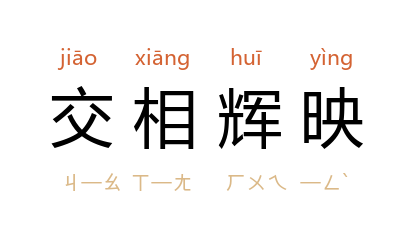 ⒈ 各种光彩相互照耀。「一泓翠绿的湖光,倒映著漫山的枫红,交相辉映,美丽极了。」