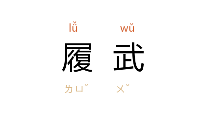 ⒈  践迹。《诗·大雅·生民》:“厥初生民,时维姜源。生民如何?克禋克祀,以弗无子。履帝武敏歆,攸介攸止。载震载夙,载生载育,时维后稷。”毛传:“履,践也。武,迹。”郑玄笺:“有大神之迹,姜源履之,足不能满。履其拇指之处,心体歆歆然。然其左右所止住如有人道感己者也,于是遂有身。”后即以“履武”为圣人降生的典故。