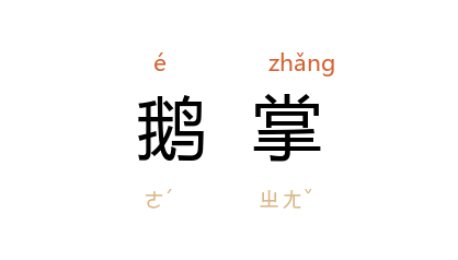 ⒈ 鹅足有薄皮相连,如人手掌,称为「鹅掌」。
