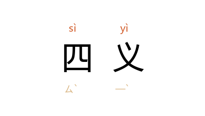 引《管子·幼官》:“八会诸侯,令曰:立四义而毋议者,尚之於玄官,听於三公。”尹知章 注:“四义者,谓无障谷,无贮粟,无易树子,无以妾为妻。”《淮南子·兵略训》:“将者必有三隧四义五行十守……所谓四义者,便国不负兵,为主不顾身,见难不畏死,决疑不辟罪。”