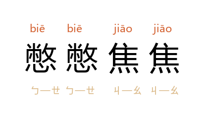 ⒈ 急躁、焦烦生气的样子。元·秦?夫也作「憋憋懆懆」、「焦焦憋憋」、「憔憔憋憋」。